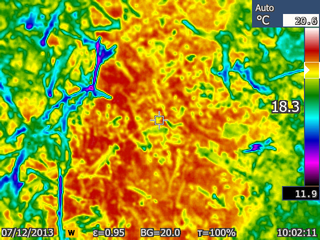 The first picture shows the thermal image of the top of the heap with plastic and duvet in place and the second the top of the composting material itself, quite a bit of which has only recently been added, so not up to temperature yet. The temperature at the centre of the photos is shown as a figure on the right hand side, the range of temperatures in the photo is on the scale on the right. 6C is approx 43F