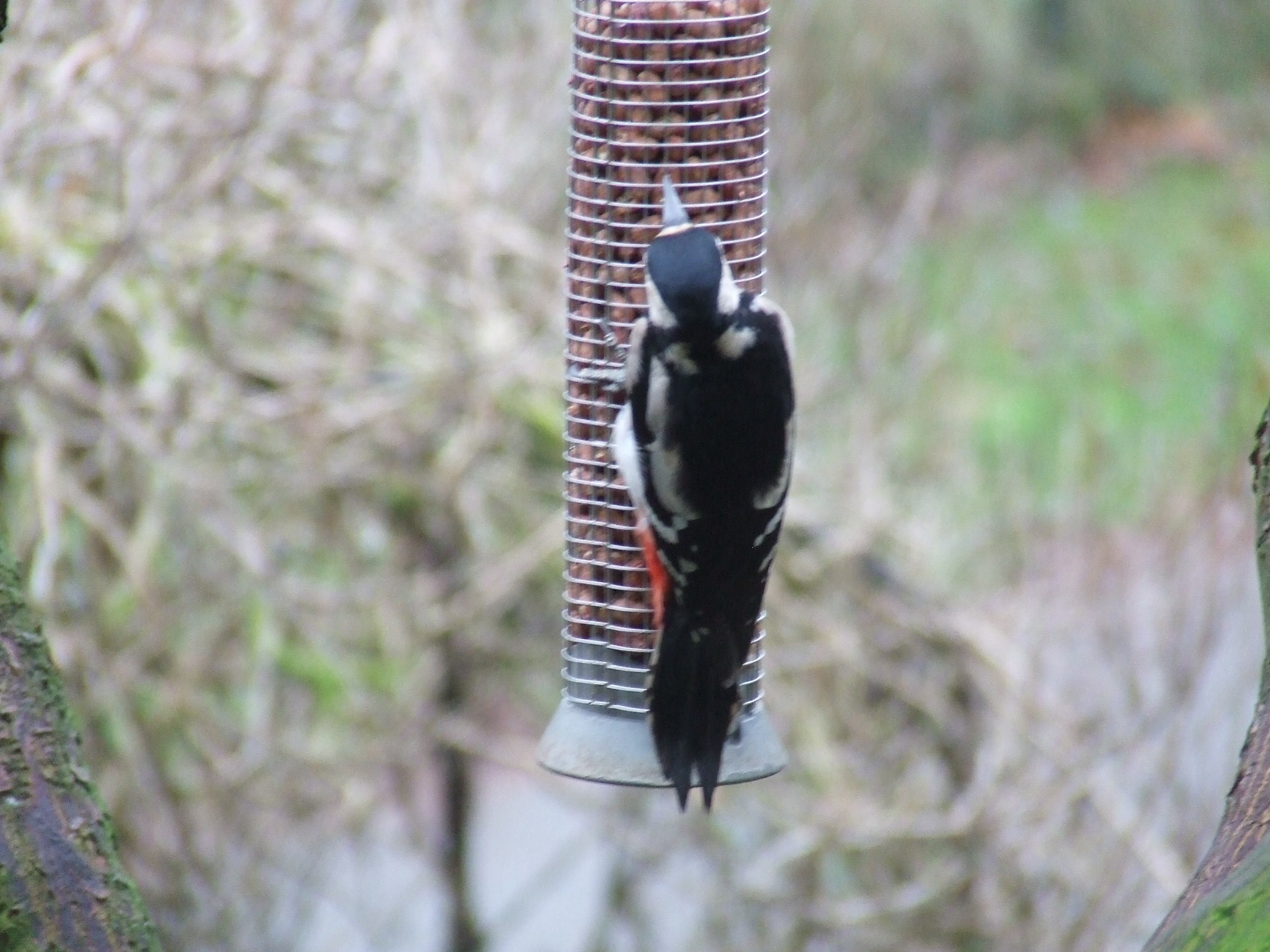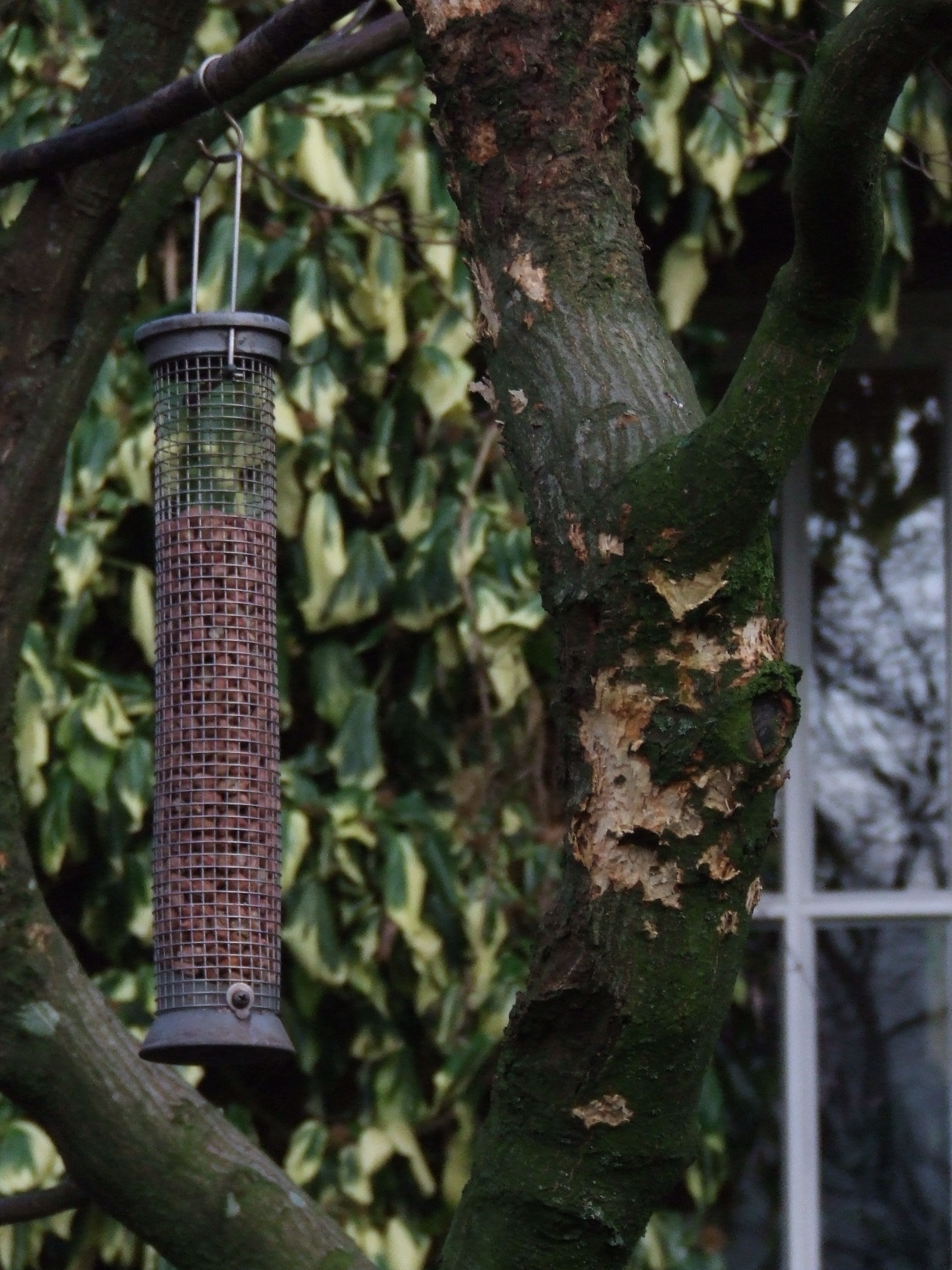 One welcome sight is the woodpecker, a shy creature which often flies off as soon as one moves inside the house. But one is becoming a bit of a pest. Less scared than previous woodpeckers, we now find that as well as coming to feed on the nuts, it is taking great chunks out of the red-leafed maple on which the feeder hangs. The damage is quite extensive – no doubt it is searching for bugs under the moss and bark.