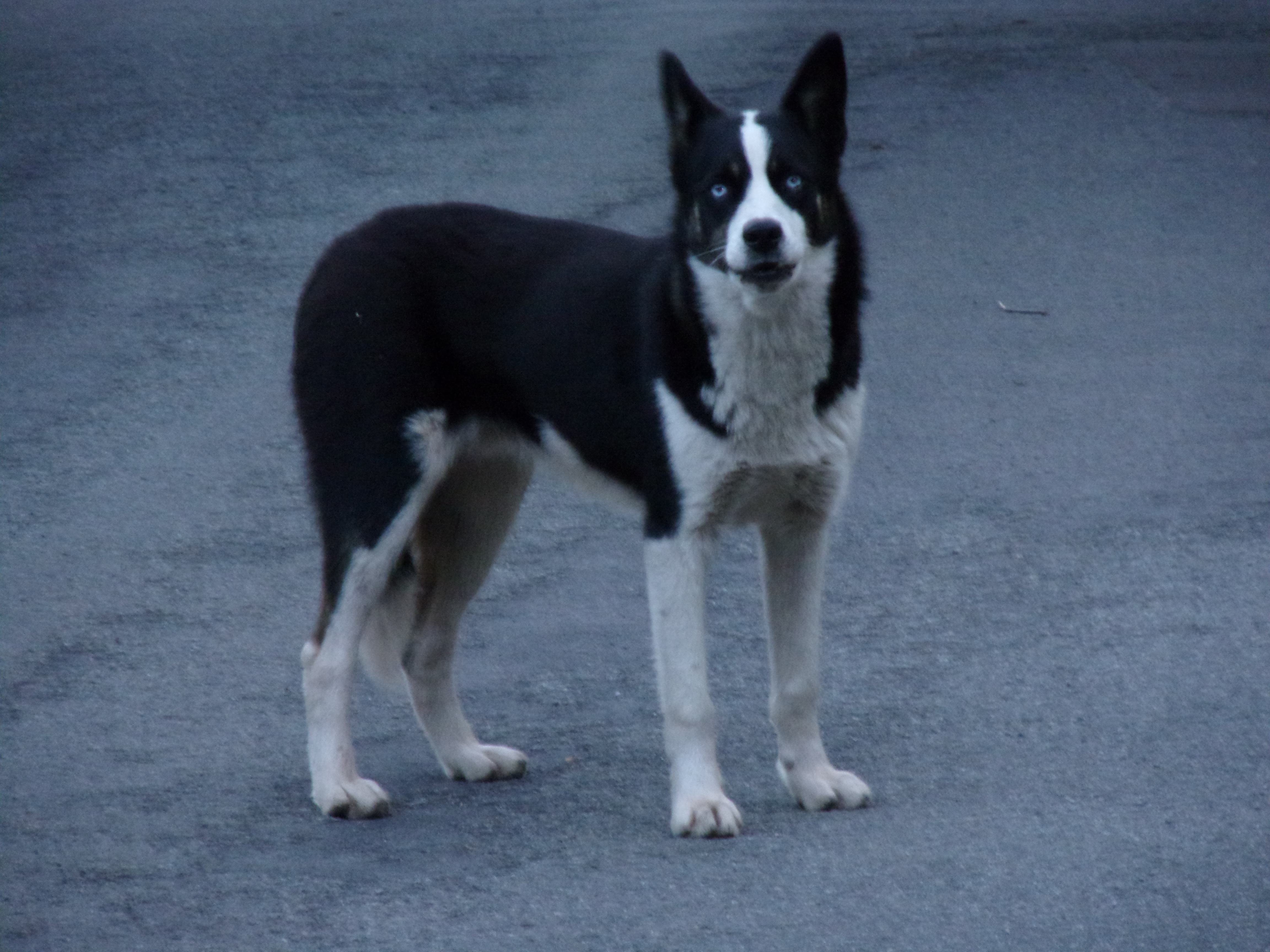 Over the next few days we tried to find out if he was a local farm dog who’d just got lost – the weather had been pretty nasty the day he turned up – but without any success. He’s pretty distinctive, with a white blaze over his head and a white tip to his tail, plus piercing blue eyes – a bit husky or wolf-like, thus the name!