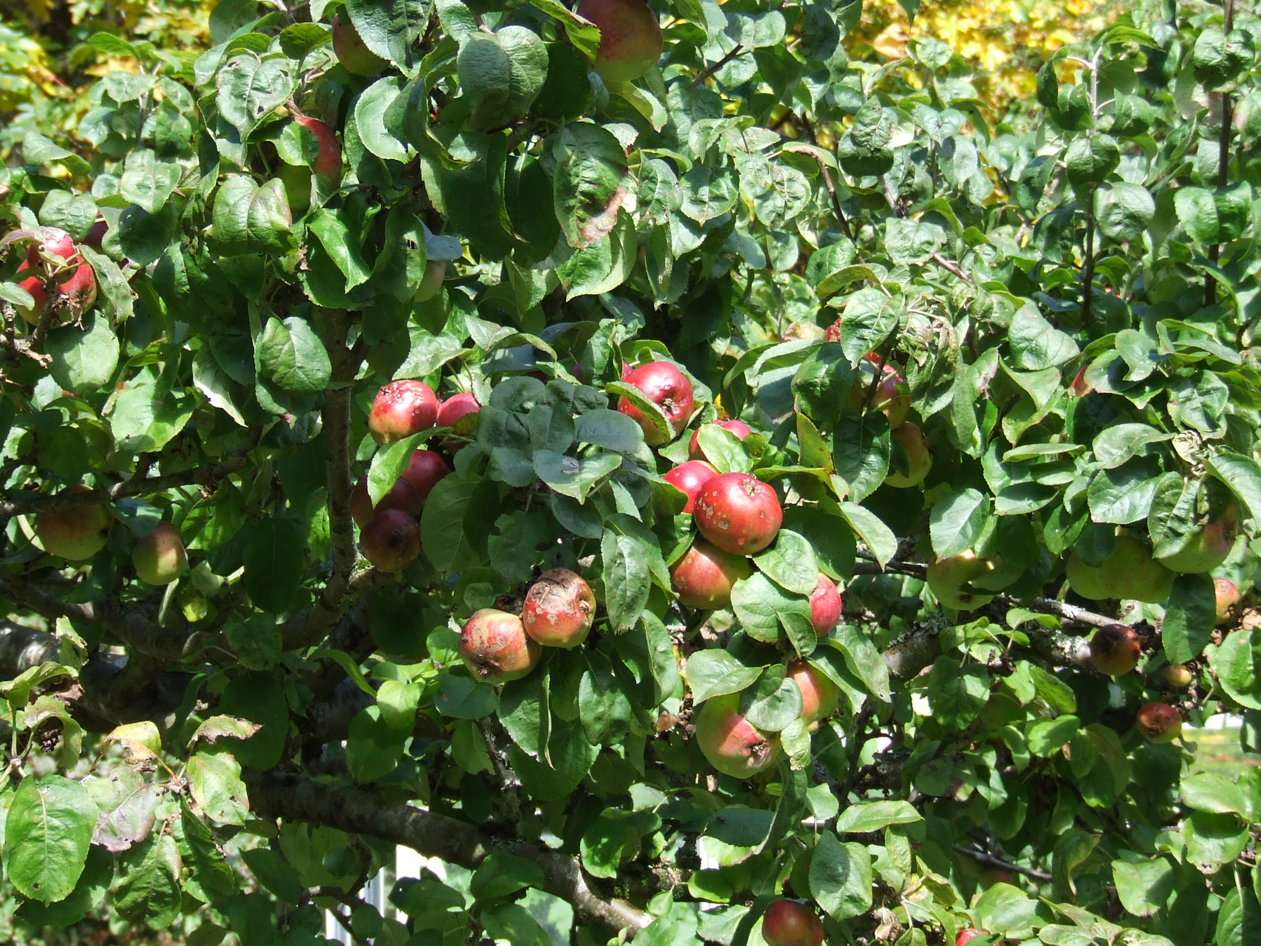 The Tom Putt apples are glowing bright red right now, probably redder than for many a year. They are a bit of an acquired taste and go brown as you are eating them, so it will probably be juice / cider as the outcome for these. All three trees are well covered.