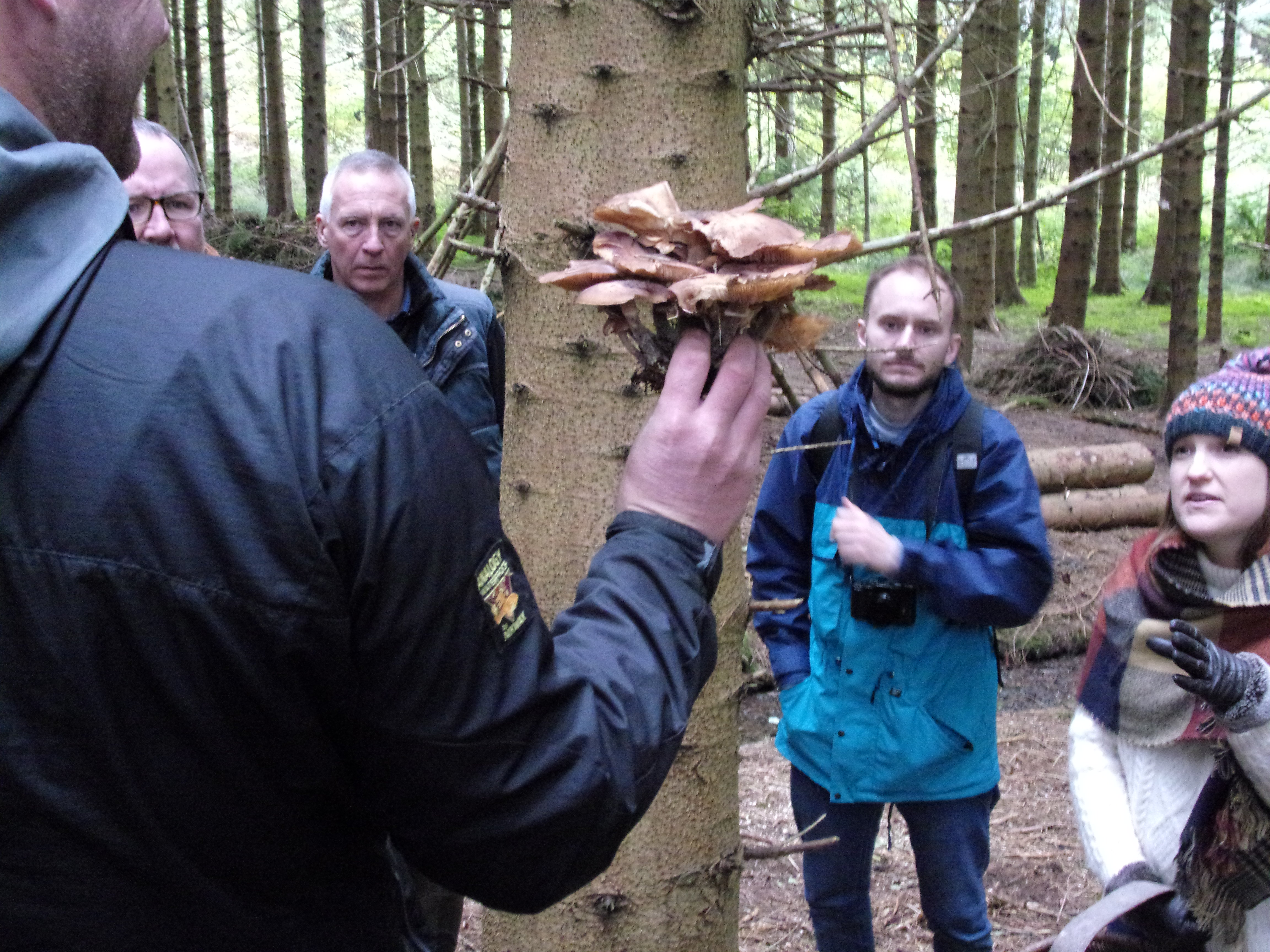 Deeper in the woods we found some Orange Grisette under the birch trees, which are good to eat and are often found with birch. The physical form of the Grisette is very similar to that of the poisonous Fly Agaric, although the latter’s bright red is a bit of a giveaway. Mark had brought some of these with him and used this as an opportunity to explain the life cycle appearance of many fungi.