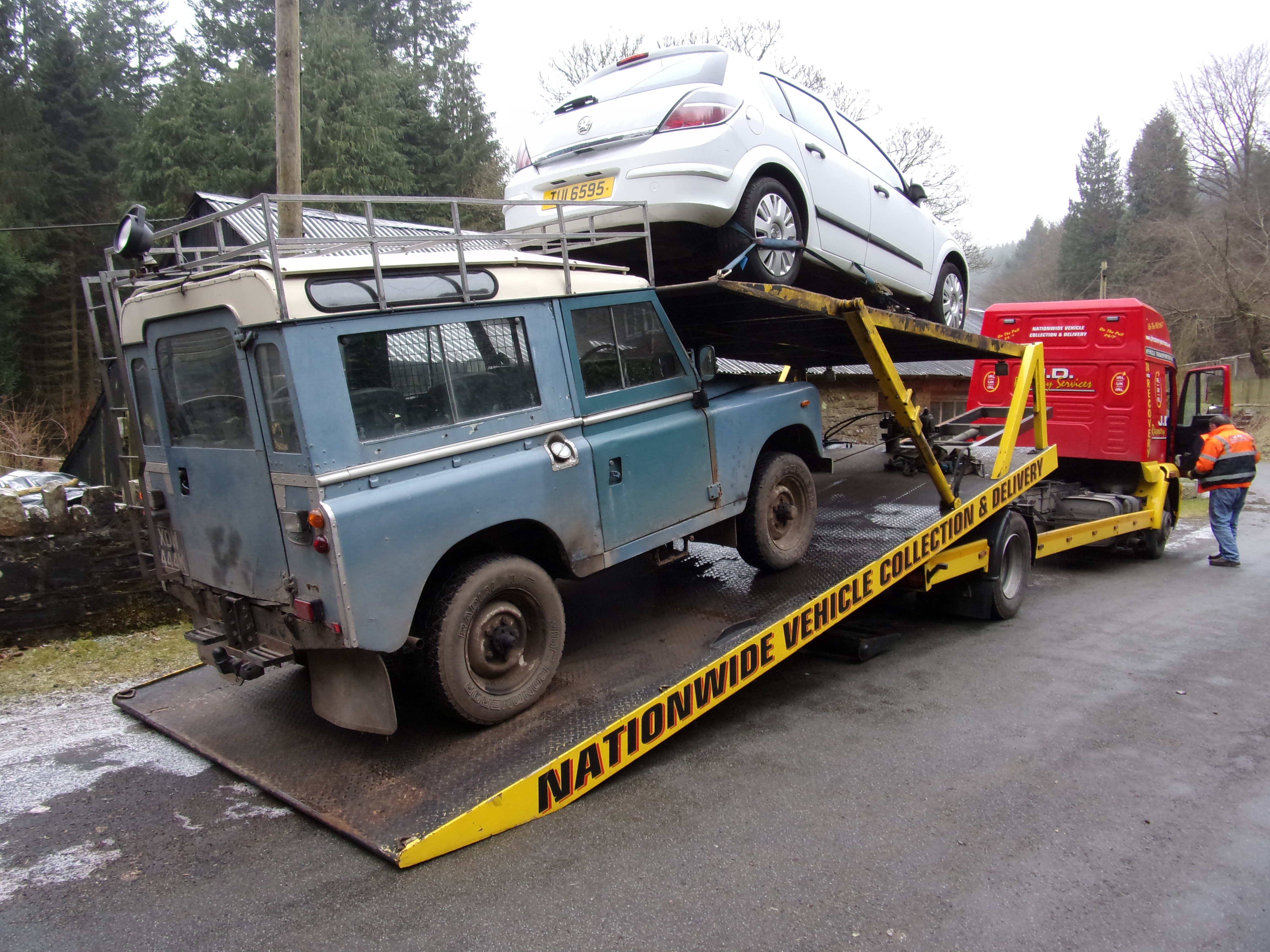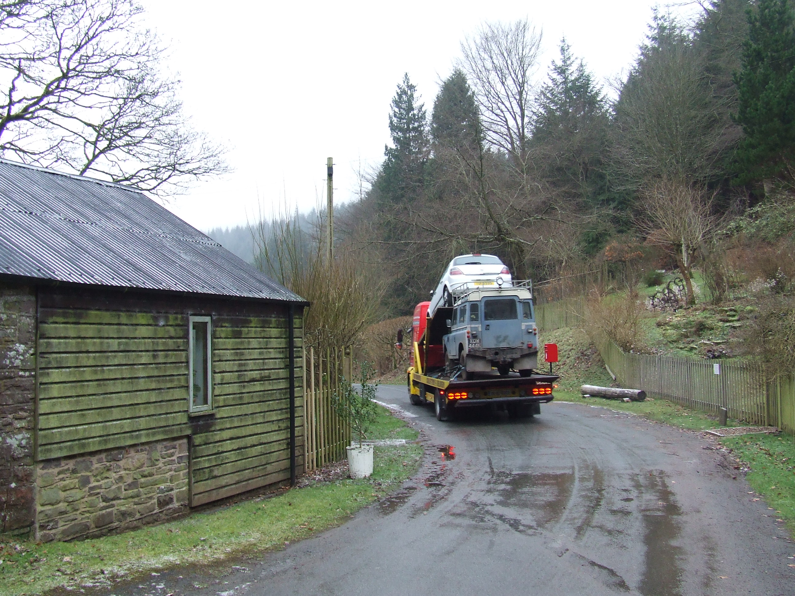 In early January a call came though to ask if it could be collected “in a couple of hours”. This was 7pm so I suggested the following morning may be better especially as his truck would be too large to get up our road easily. 8.30 the following morning I rolled into Llanfihangel and there was the transporter. The driver looked a bit unsure, and lo and behold, with the roofrack Layla was too high to fit on. So back she came.