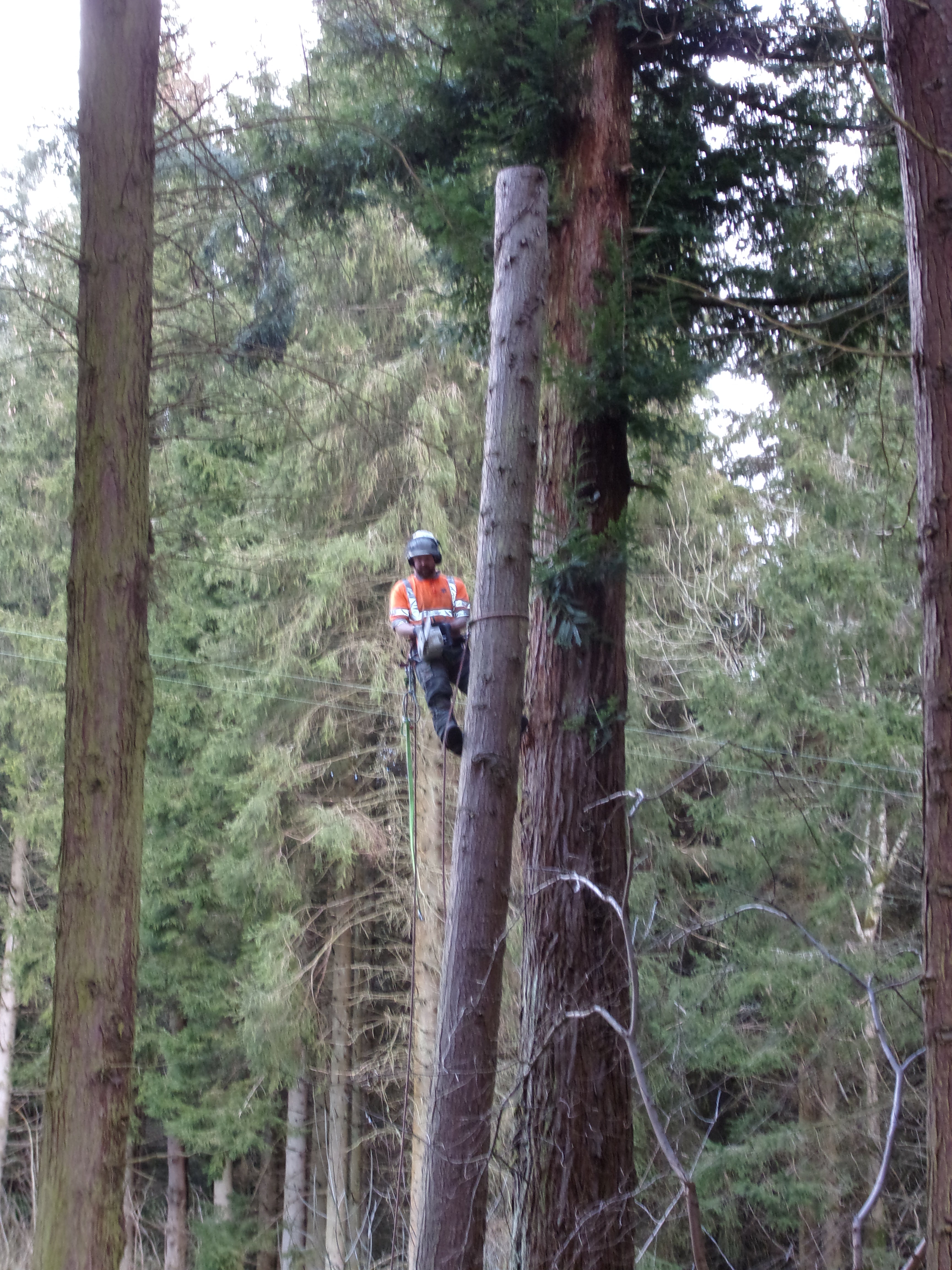 which are even taller. Having acquired a felling licence to fell 5 of them to provide timber for the construction of our natural swimming pond we know that they are even bigger – some were 150 feet tall. These need a bit more than Ian and his chainsaw.