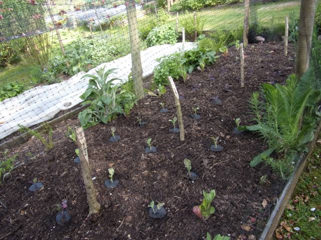Yesterday I planted out the first of the brassicas – Purple Sprouting Broccoli (PSB to the initiated), Calabrese Waltham (which is a new variety for us, but as we discovered the fantastic garden at Waltham Place last summer I felt I had to try it – even if there is no connection) , Theyer Heritage Kale (we are members of the Heritage Seed Library and grow different Heritage varieties every year) and Redbor and Pentland Brig Kale (both our own seed). Again the compost connection is ‘no dig’. I covered the bed with compost some weeks ago and planted the brassicas into this layer. The whole bed is covered with black plastic netting to protect from the very pretty cabbage white butterflies which are welcome to feed on sacrificial cabbagey things elsewhere in the garden.