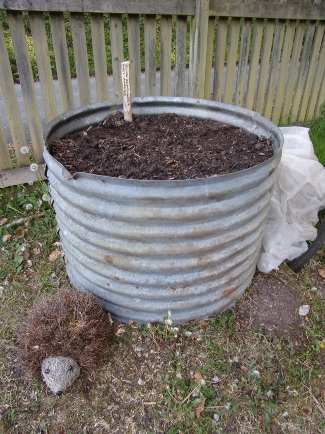 So the experiment is to see whether we can grow potatoes successfully in a mix of composted (i.e. left in a heap in the forest for a couple of years) wood-chip and my own garden compost. We’ve put this in a large container in full sun in the woodyard where we can keep an eye on it – and even water it if necessary (I think moisture-retention might be an issue with the wood-chip) as it’s next to one of our rainwater harvesting barrels.