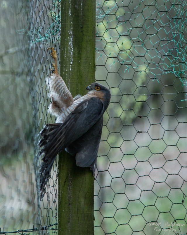 Just then I spotted a commotion in the chicken run. I’d already shut them up and all seemed in order. I ran across and realise that there was a rather large bird thrashing about inside the netting. It was a sparrow-hawk!