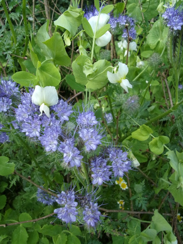 Peas (Early Onward, heritage variety Robinson, Ezethas Krombek Blau (a purple flowered, purple podded variety) and Greenshaft and Sugar Ann sugar snap were all started in guttering and then planted out. All are looking great. I’m particularly pleased with the combination of the flowering peas and over-wintered Phacelia – a brilliant bee plant which I planted as winter ground cover and then moved plants around in the bed to allow for the rows of peas to be slipped in from the guttering. Hoping for a good crop of peas.