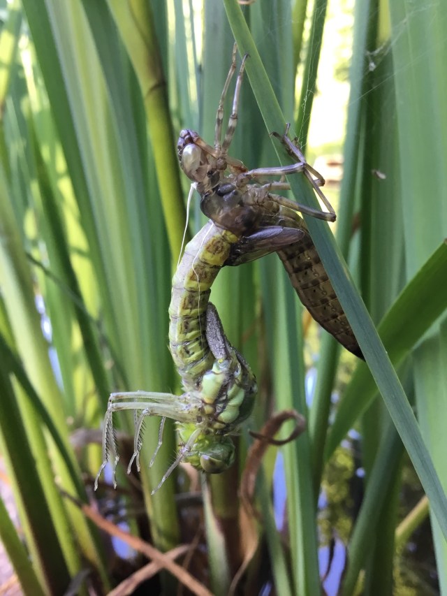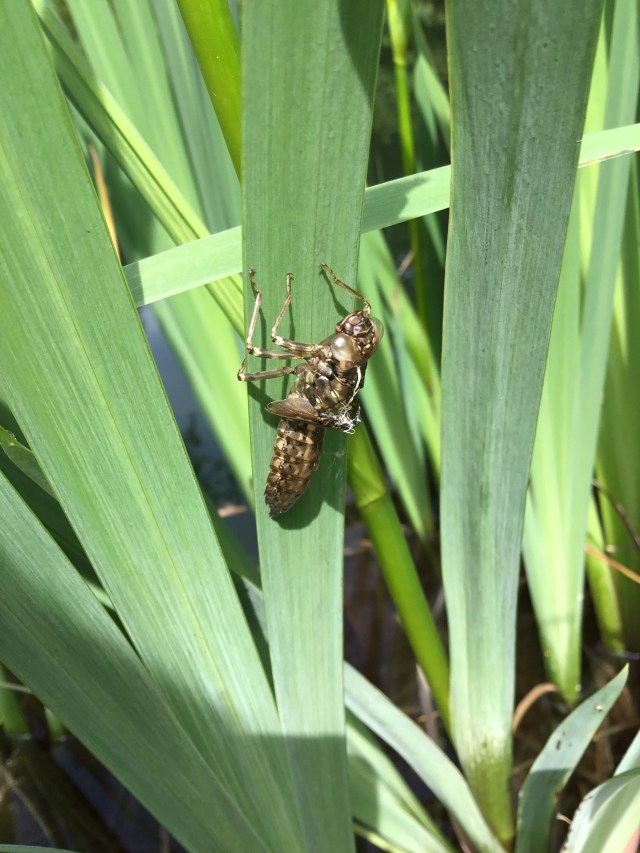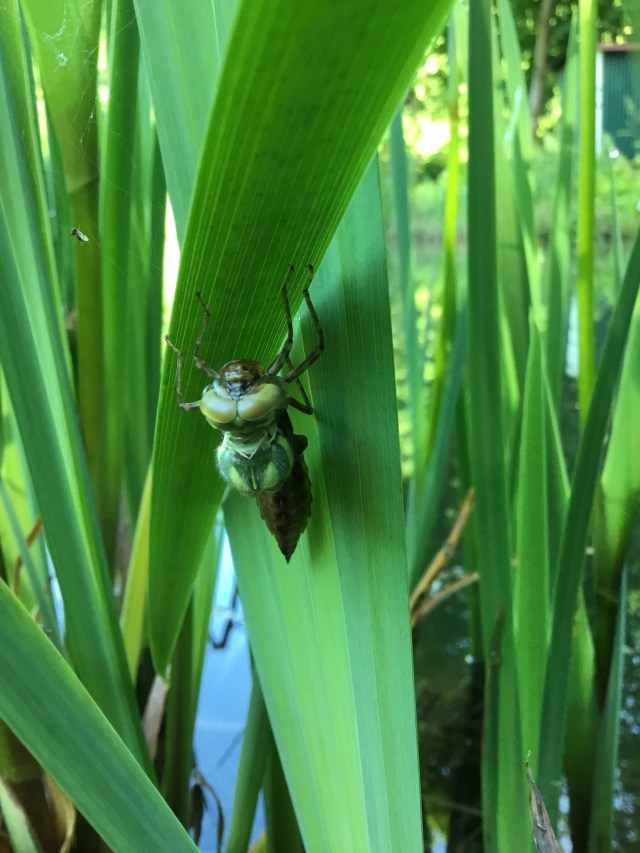 So back to the Hawkers. The first thing to see are the nymphs waiting in the water for the right time to clamber out and up an iris leaf. We make sure there are always sufficient tall stems for them – leaving last year’s flower spikes on the purple loosestrife for instance.