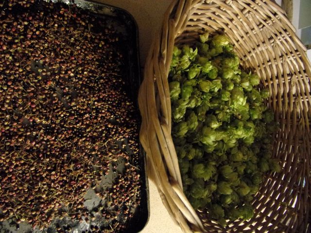 From my point of view the two most important crops were the Sichuan Peppercorns and the hops. I planted Fuggles and Goldings hop varieties about ten years ago. Every year they romp up the strings and occasionally produce a few flowers, which invariably turn brown before they are properly ripe. This year the main patch was so full of flowers that they bent two metal 10mm square supporting poles. This is no mean feat and a full carrier bag of flowers weighs about five ounces. You get the idea of how much there was. Eventually I managed to pick and dry enough for about 7 or 8 homebrews, but it is slow, tedious work and there were other things requiring my time.