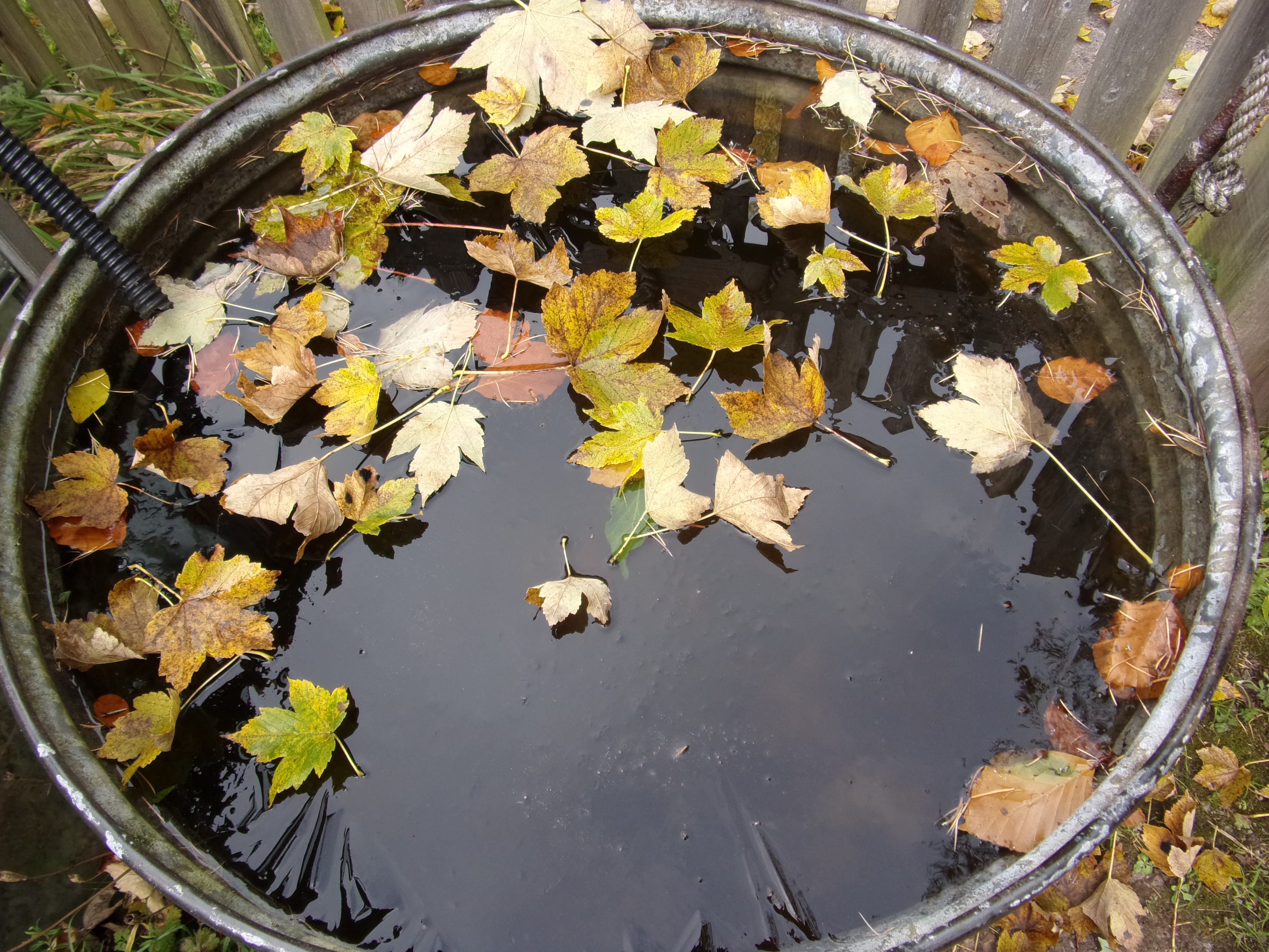 As October drew to a close we had some amazing evening skies. Difficult to get good phots with basic cameras, but this will give you an idea. Of course the leaves were falling by now so much effort was in raking and refilling the leafmould bins. But where they fall on water they do make for a pretty picture.