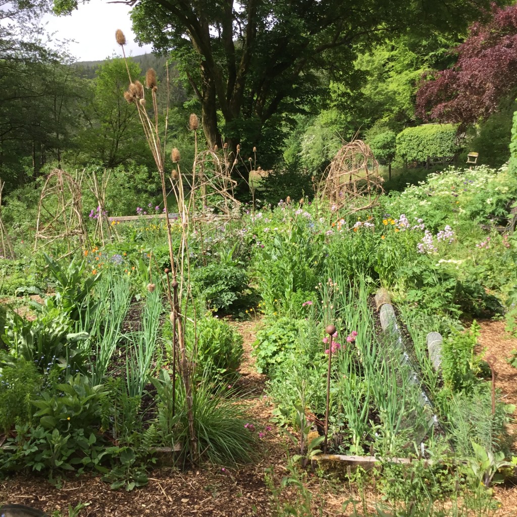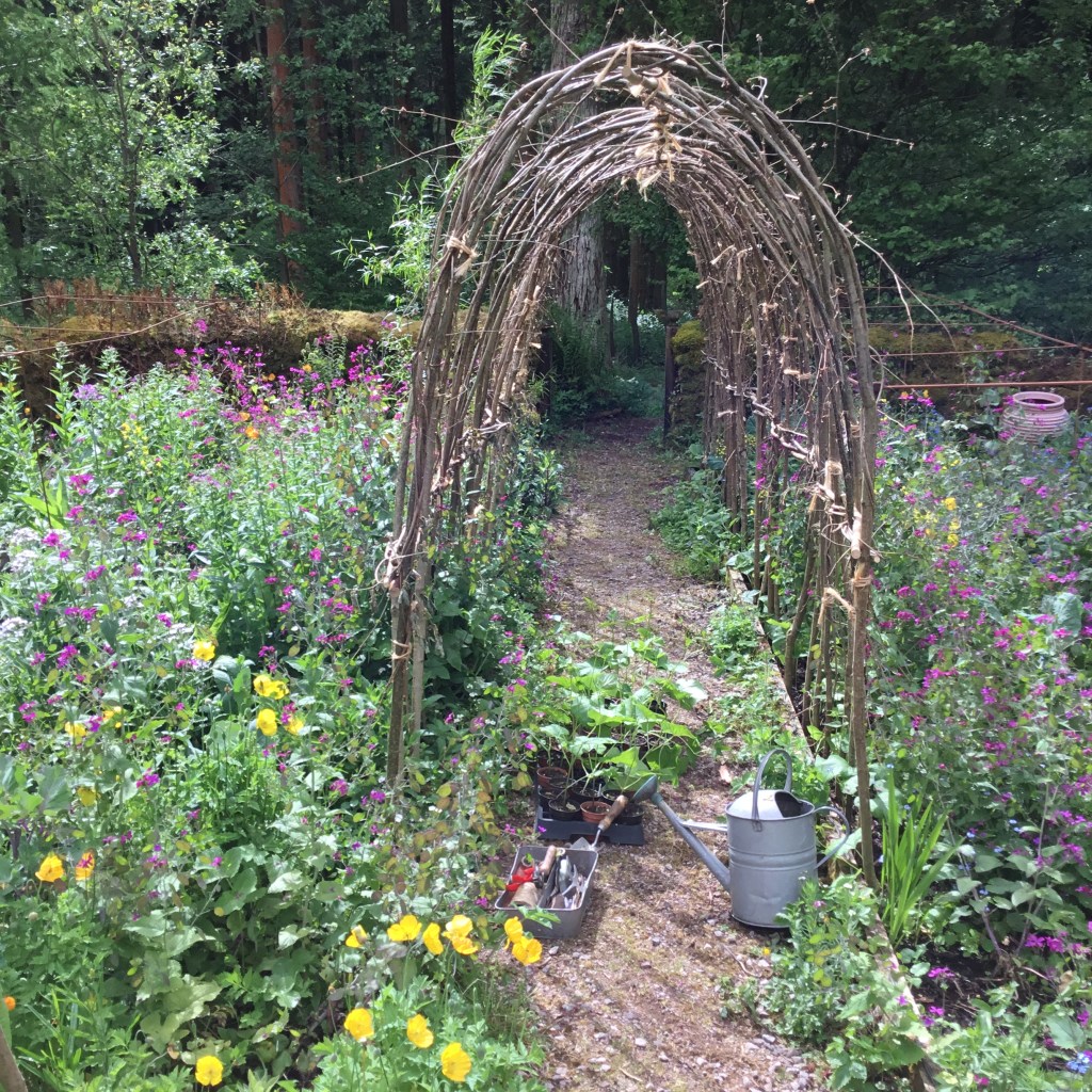 Through the gate into the potager, home of flowers and vegetables, and wonderful hazel support frames.
