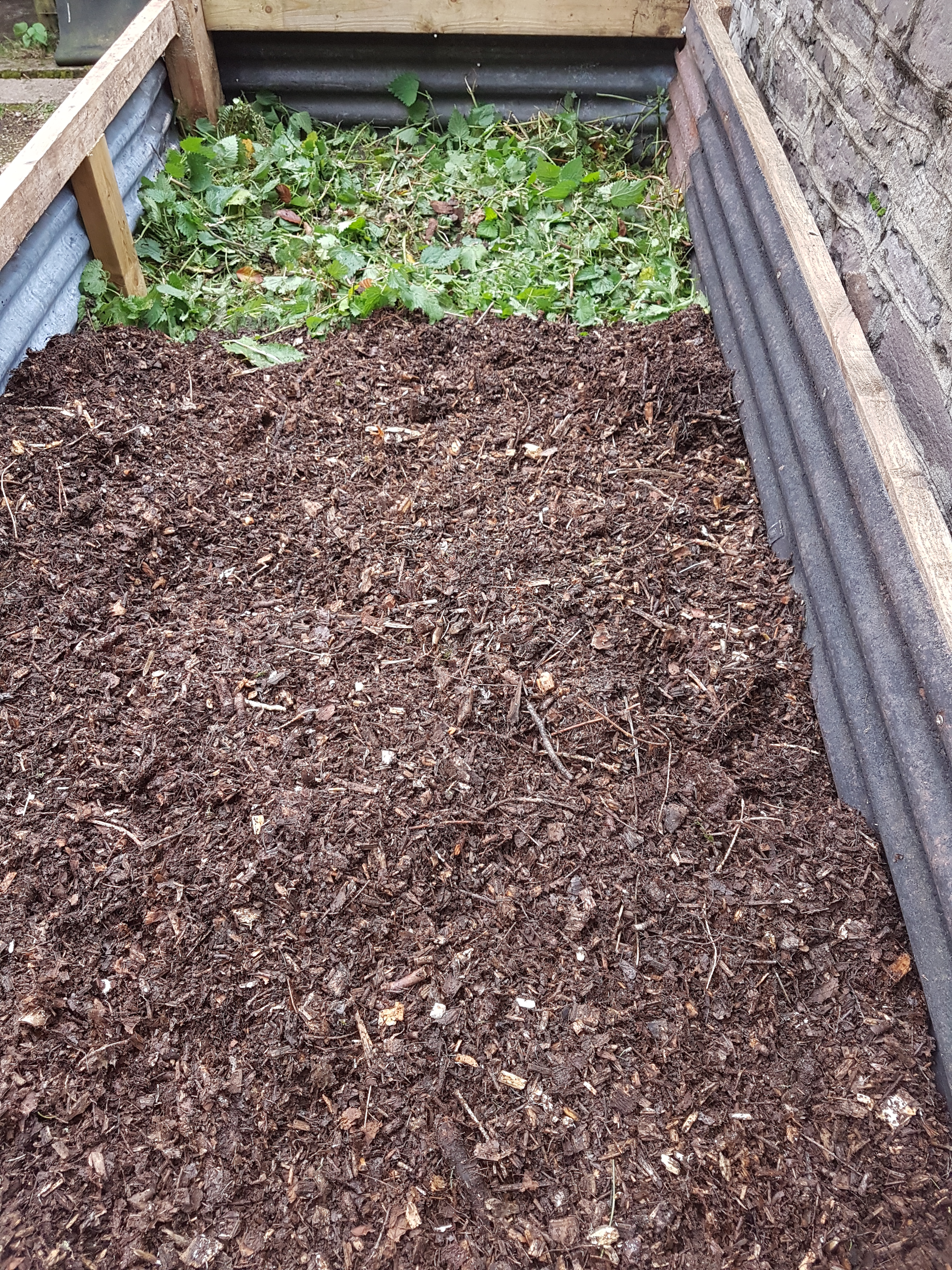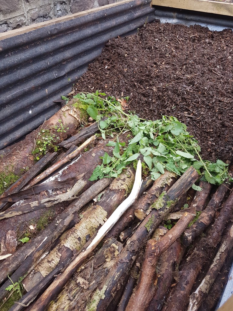 On top of the logs goes a layer of green material – here it’s freshly cut nettles – and then a layer of well rotted woodchip – yet more trips with the Fergie.