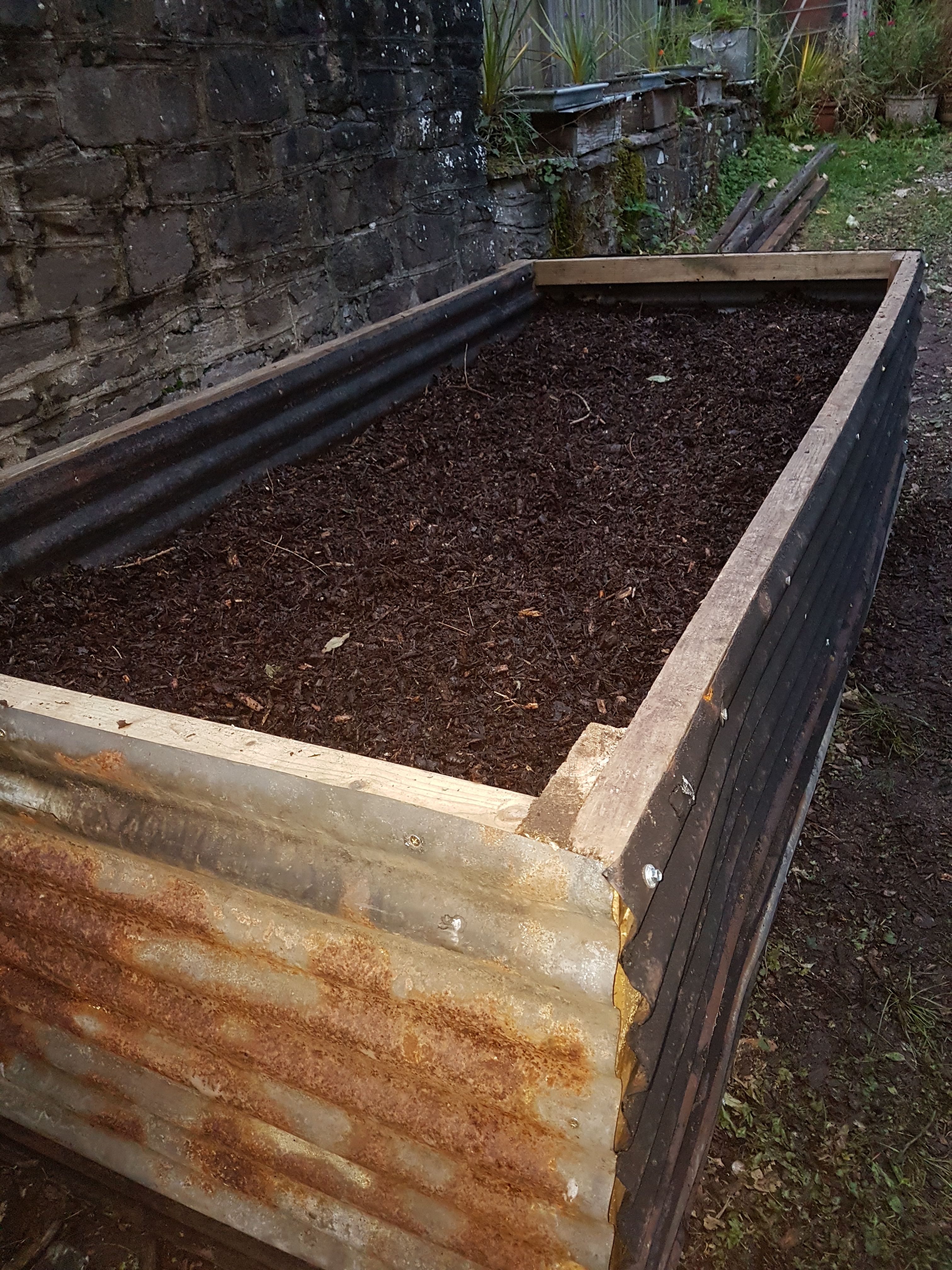 But now we have a big pile of slightly rusty wriggly tin. What to do with it? How about a new garlic bed / container? After all the round wriggly tin works well in the yard tfor the fuschia. Cue Sue’s “I’ve got an idea!” and me disappearing under the duvet in the hope she might forget when I emerge.