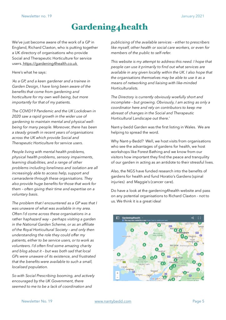 Packed with the usual interesting articles, but this time with a timely piece about gardens and health (on page 5). Much research has been undertaken, some of it sponsored by the National Garden Scheme and the results point strongly to the relationship between gardens and good health (try telling that to my back after a day’s digging!). The NGS also donates funds to both Horatio’s Gardens – at spinal injury care hospitals and Maggie’s – for cancer care units.