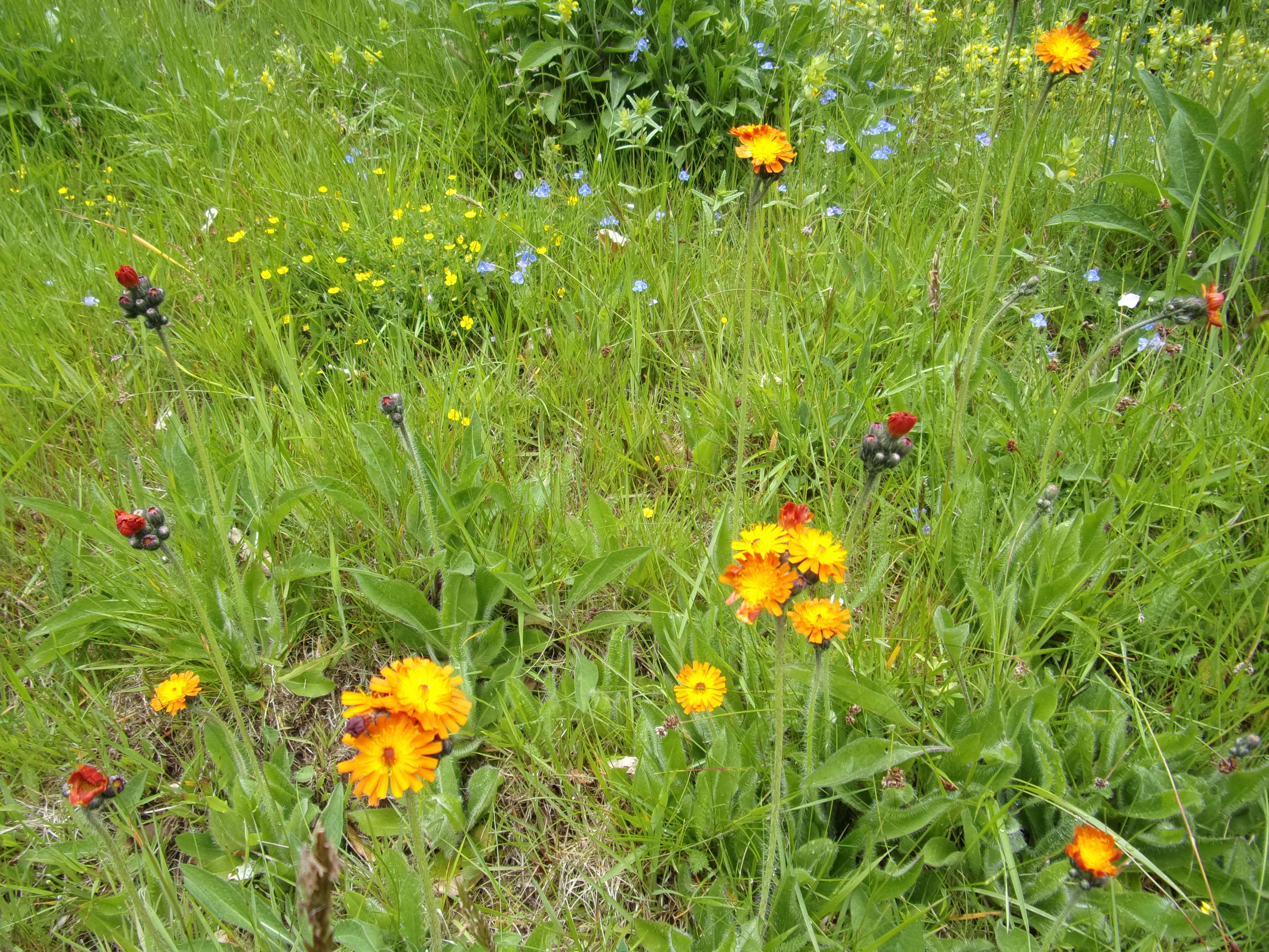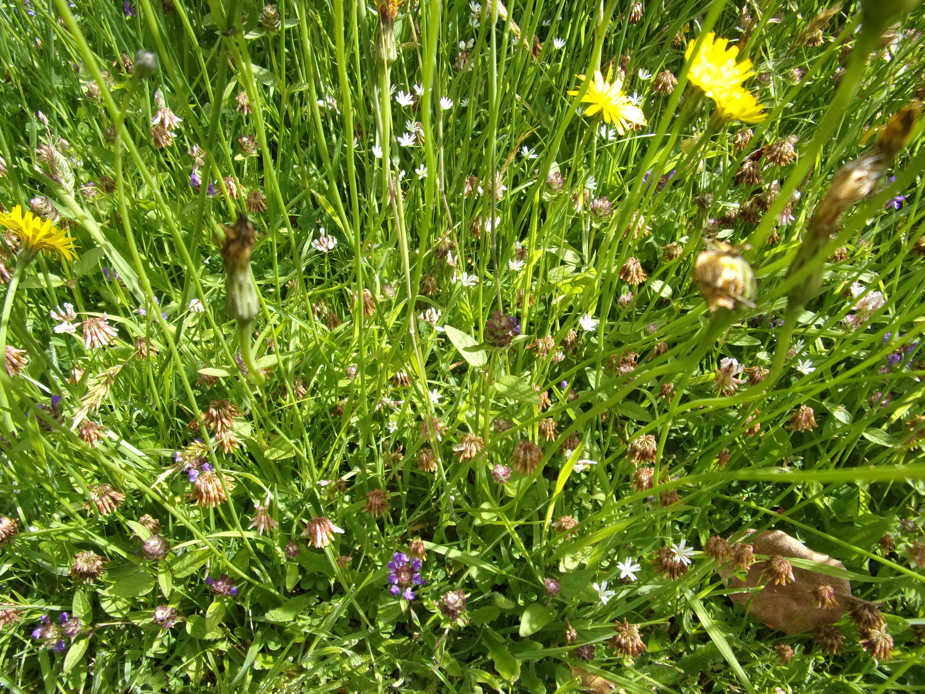 Self heal, white clover, lesser stitchwort, and one of the hawkweeds – there are several varieties.