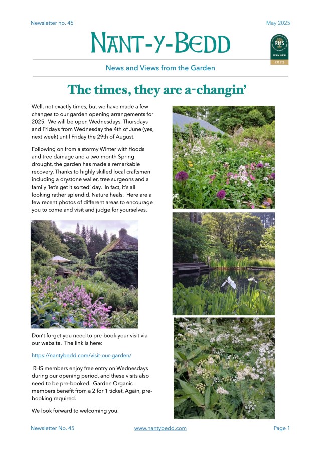 Apologies for the late posting of this, but it has been pretty busy here recently. For speedier access to the various ‘goings on’ here at Nant y Bedd drop us an email to garden@nantybedd.com asking to be added to the mailing list.